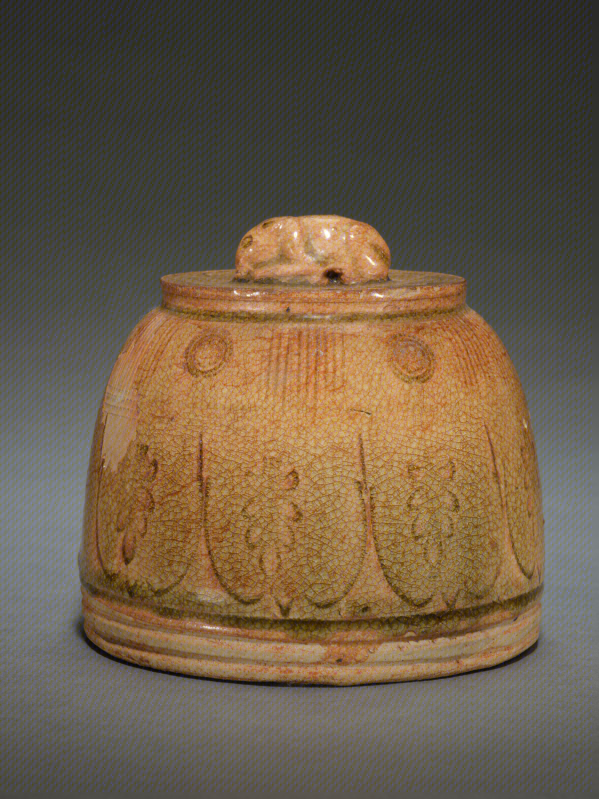 权平底,底心有一圆孔,中空,顶部饰一兔纽。器身薄施一层青釉,釉色泛黄,施釉不到底。外壁模印莲瓣纹一周,上为6组团花,间以条纹。