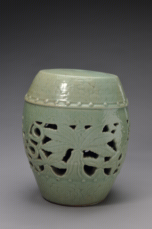 龙泉窑青釉镂空双狮花卉纹绣墩
