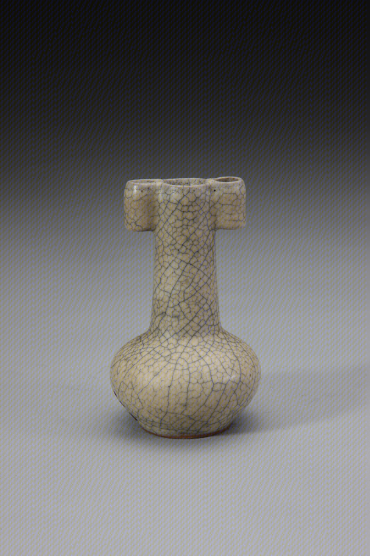 此瓶在造型上摹仿西周青铜礼器。口耳相连的曲线增加了口部力度,与扁圆形腹部上下呼应,构成视觉上的均衡,给人以稳重之感。通身细碎开片,静穆、优美。