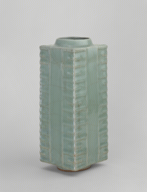 瓶仿玉琮(cóng音从)造型,口底径度相若,方形直腹,四面各以凸起横竖线纹装饰。圈足。通体施青釉,釉色莹润光亮,开细碎片纹。