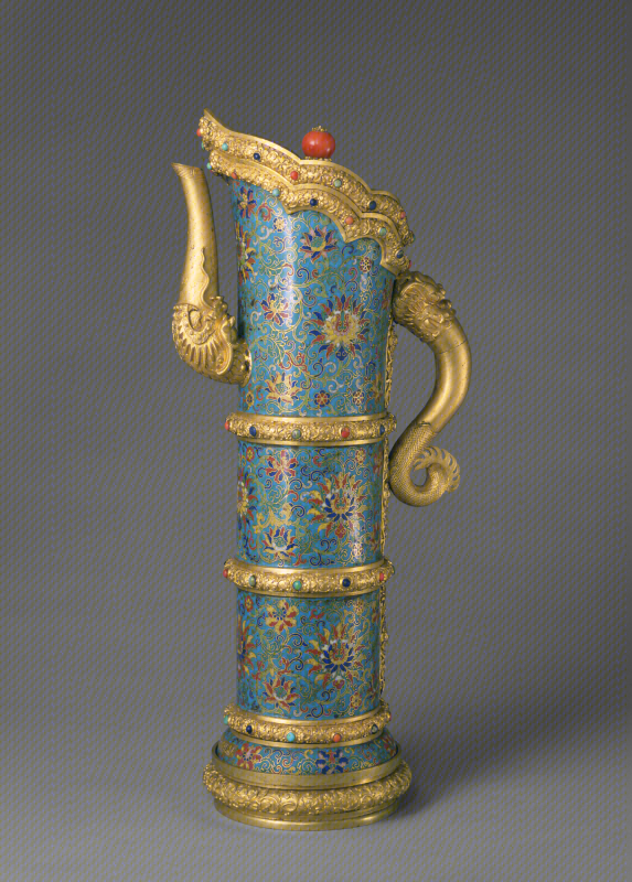壶圆筒形状,僧帽口,龙柄,龙流,盖顶嵌珊瑚珠为纽。在錾刻镀金的口沿、横箍和底座上嵌有多色宝石,整体流光溢彩、富丽堂皇。壶通体饰缠枝花卉纹,花朵大小有别,排列有序。足上嵌长方形铜镀金片,上阴刻“大清乾隆年制”楷书款。