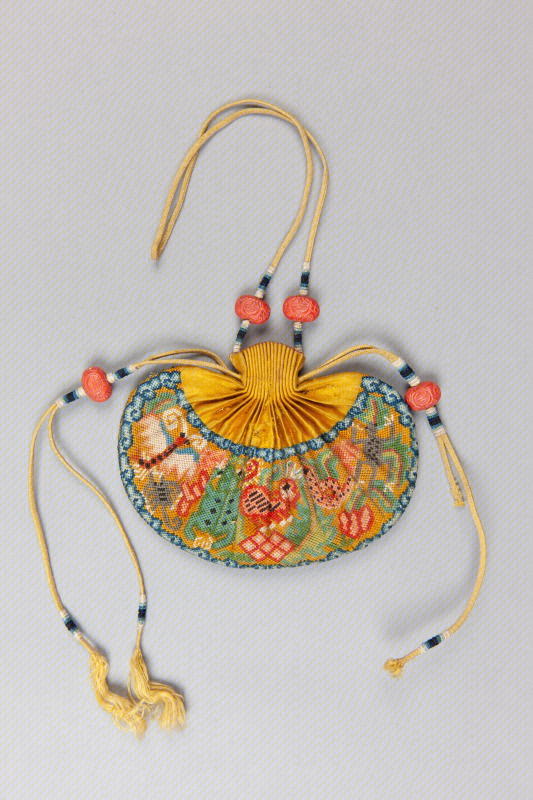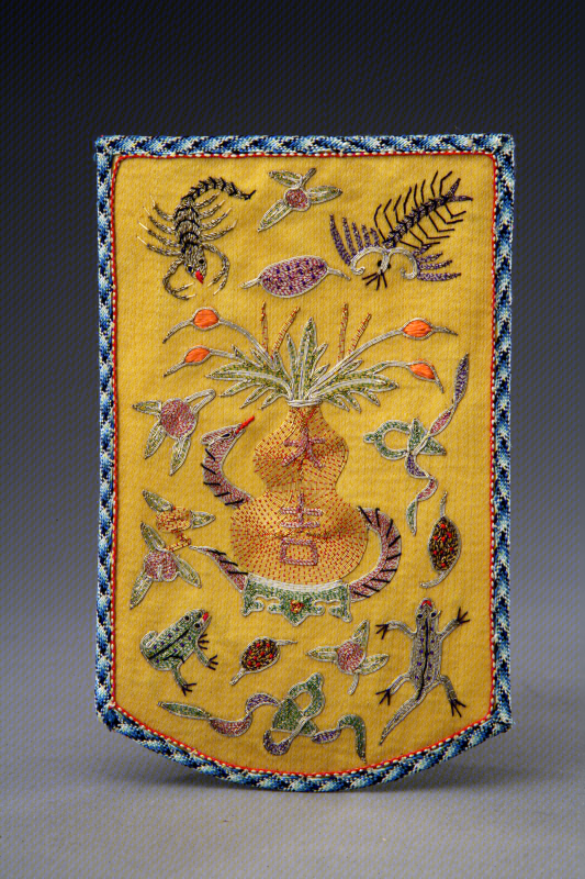 The silk tapestry depicts three Chinese deities, namely, Fortune, Wealth, and Longevity. Accompanied by a child, cranes, and a deer, they converse within a landscape of pine trees, peach trees, and scenic rockery. Plain, long-and-short, and interlocking stitches constitute some of the intricate techniques used to produce this work. The tapestry was embellished with embroidery to create the illusion of folds in the figures' garments and the texture of the fur and feathers. More than thirty colors of thread were used in the silk tapestry.